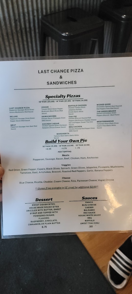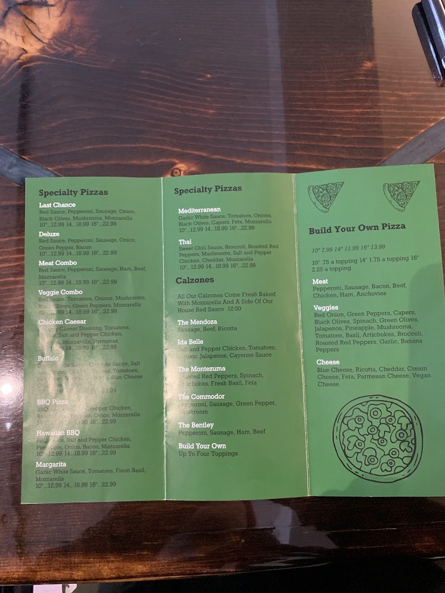 Meats: Pepperoni, Sausage, Bacon, Beef, Chicken, Ham, Anchovies • Veggies: Red Onion, Green Pepper, Caper, Black Olives, Spinach, Green Olives, Jalapeños, Pineapple, Mushrooms, Tomatoes, Basil, Artichokes, Broccoli, Roasted Red Peppers, Garlic, Banana Peppers • Cheese: Blue Cheese, Ricotta, Cheddar, Cream Cheese, Feta, Parmesan Cheese, Vegan Cheese • Gluten-free Crust available in 10" crust +$2.00 | 10" Toppings +$0.75 | 14" Toppings +$1.75 | 16" Toppings +$2.25